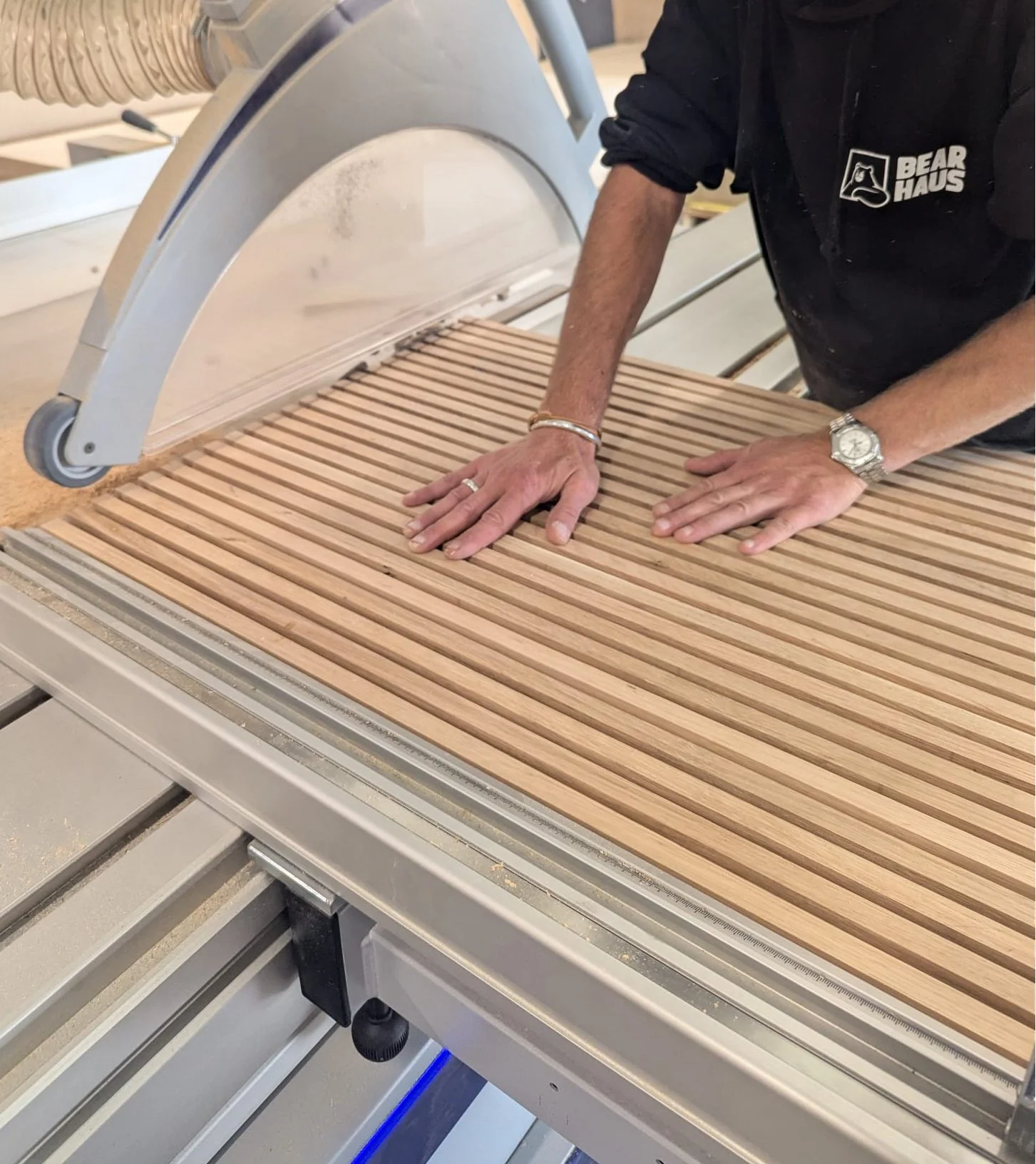 In the workshop, the kitchen was taking shape, crafted from durable oak veneer with sleek ebonised oak plinths.